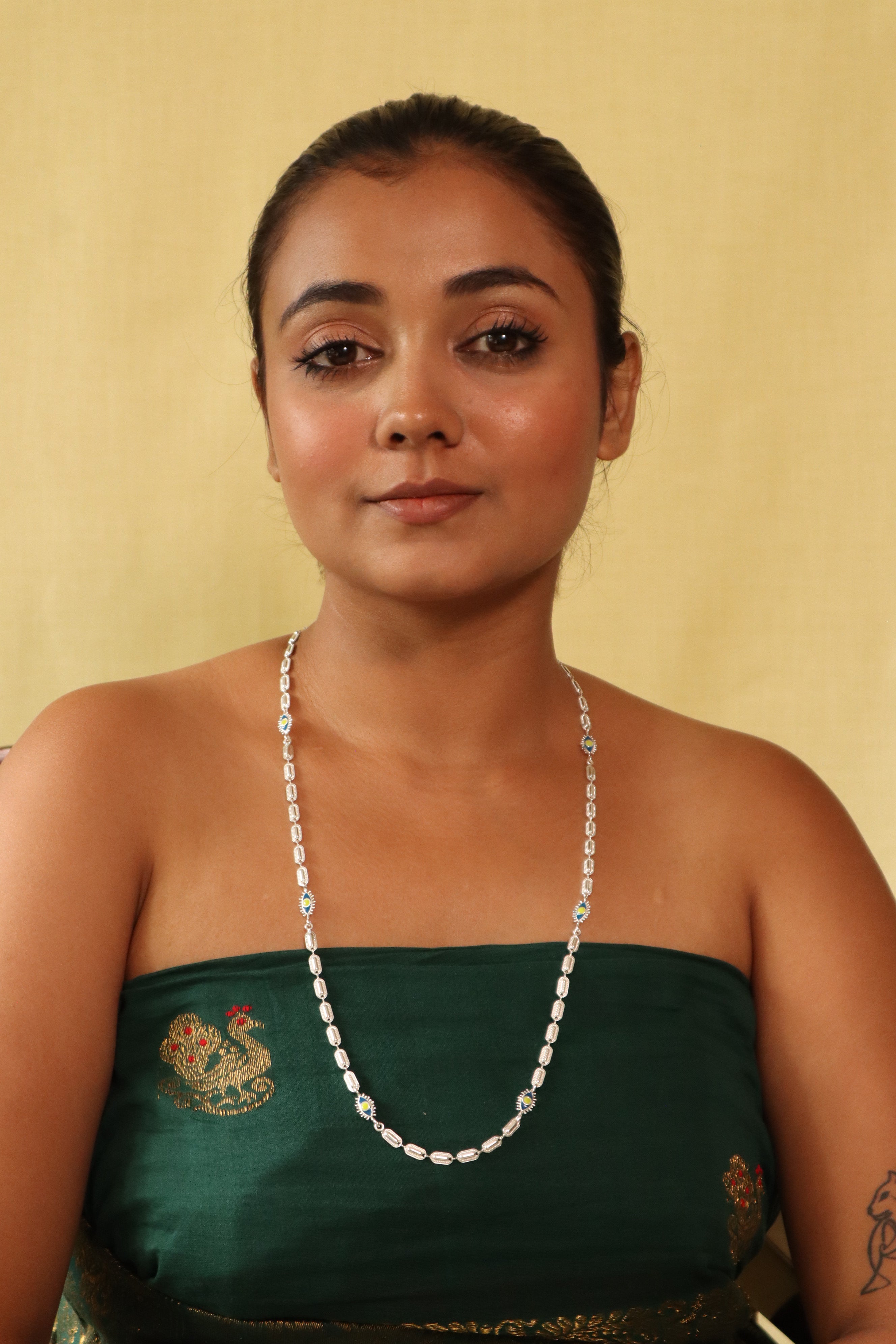 Across cultures, the nazar or evil eye is worn for protection — to deflect envy, negativity, or unwanted energy. We embedded it into this vintage-inspired chain with repeating engraved links and bursts of blue enamel. A piece that’s as grounding as it is ornamental — made to be worn like armor, with softness.