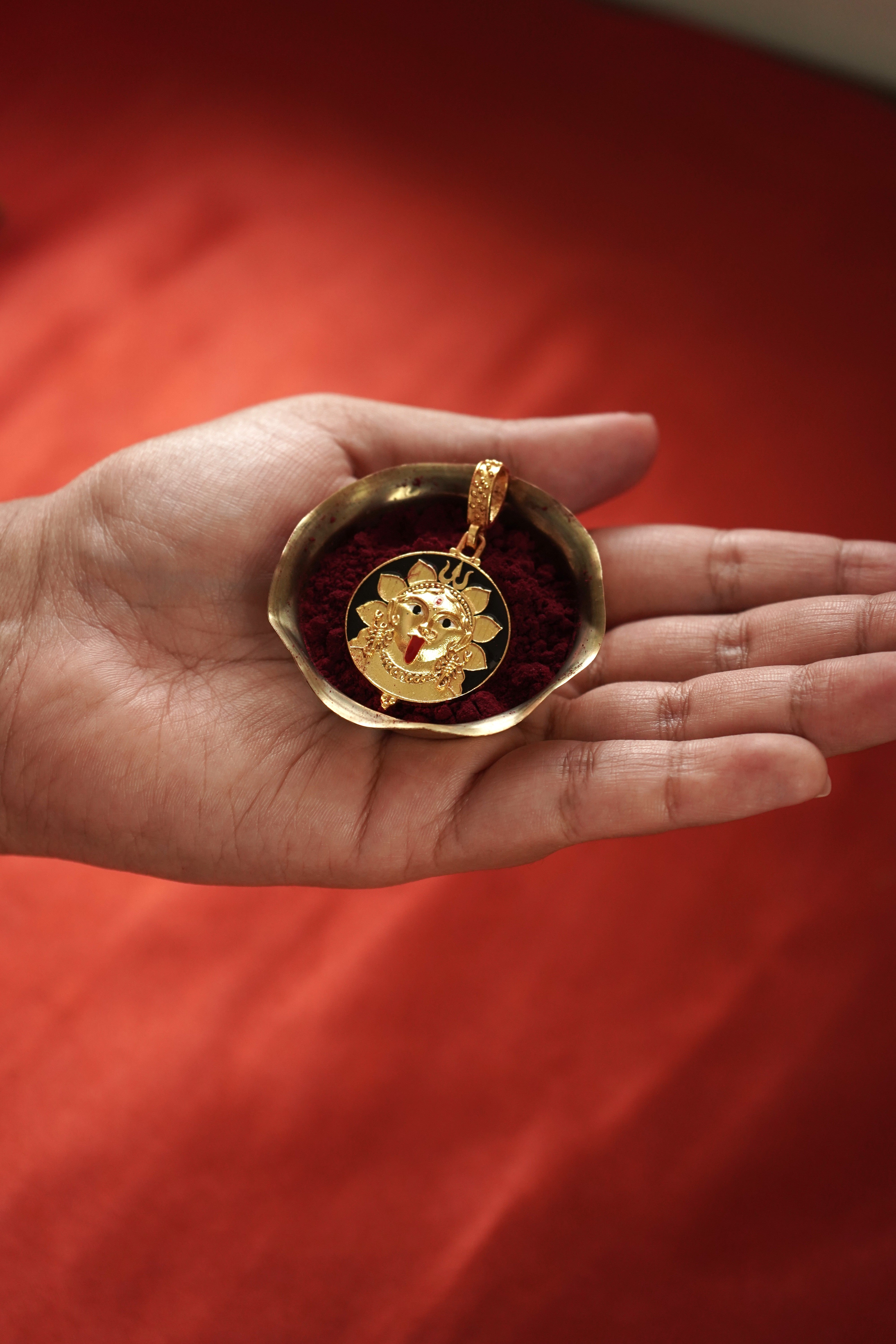 A handmade 18k gold-plated pendant with black enamel, featuring Goddess Kali — fierce, protective, and untamed. Designed as a modern amulet, this piece draws from traditional iconography where Kali symbolizes transformation, strength, and the power that destroys darkness.