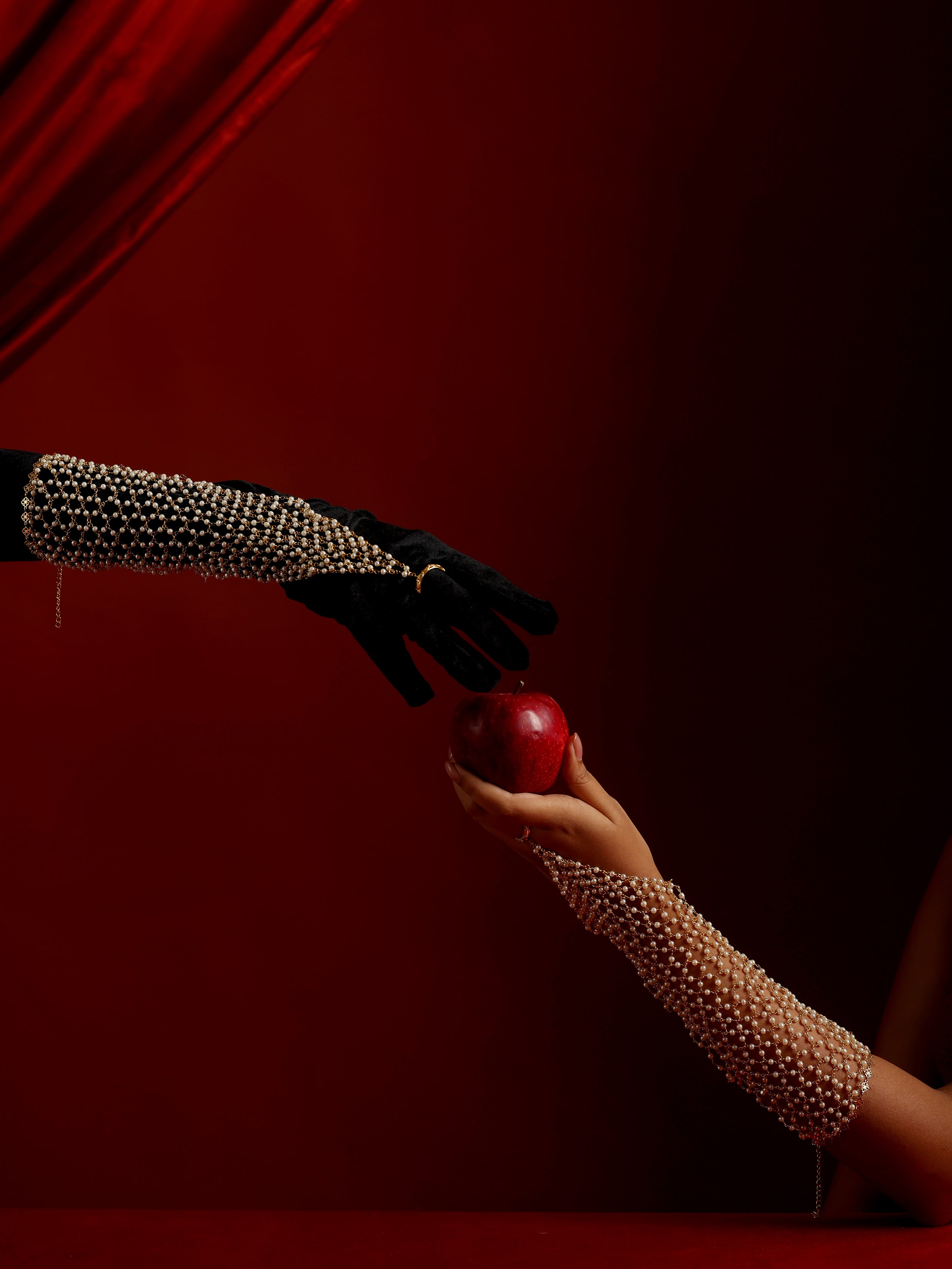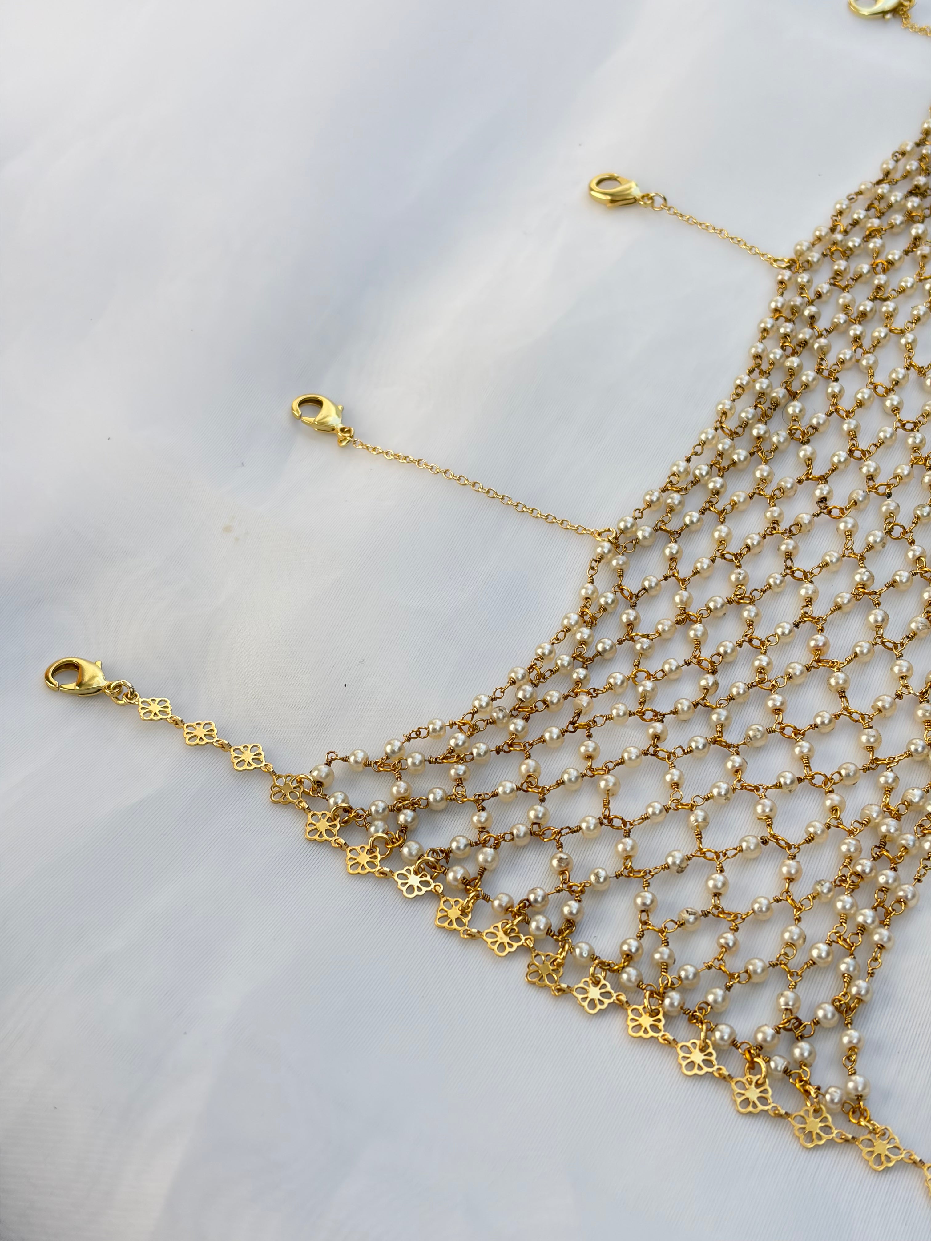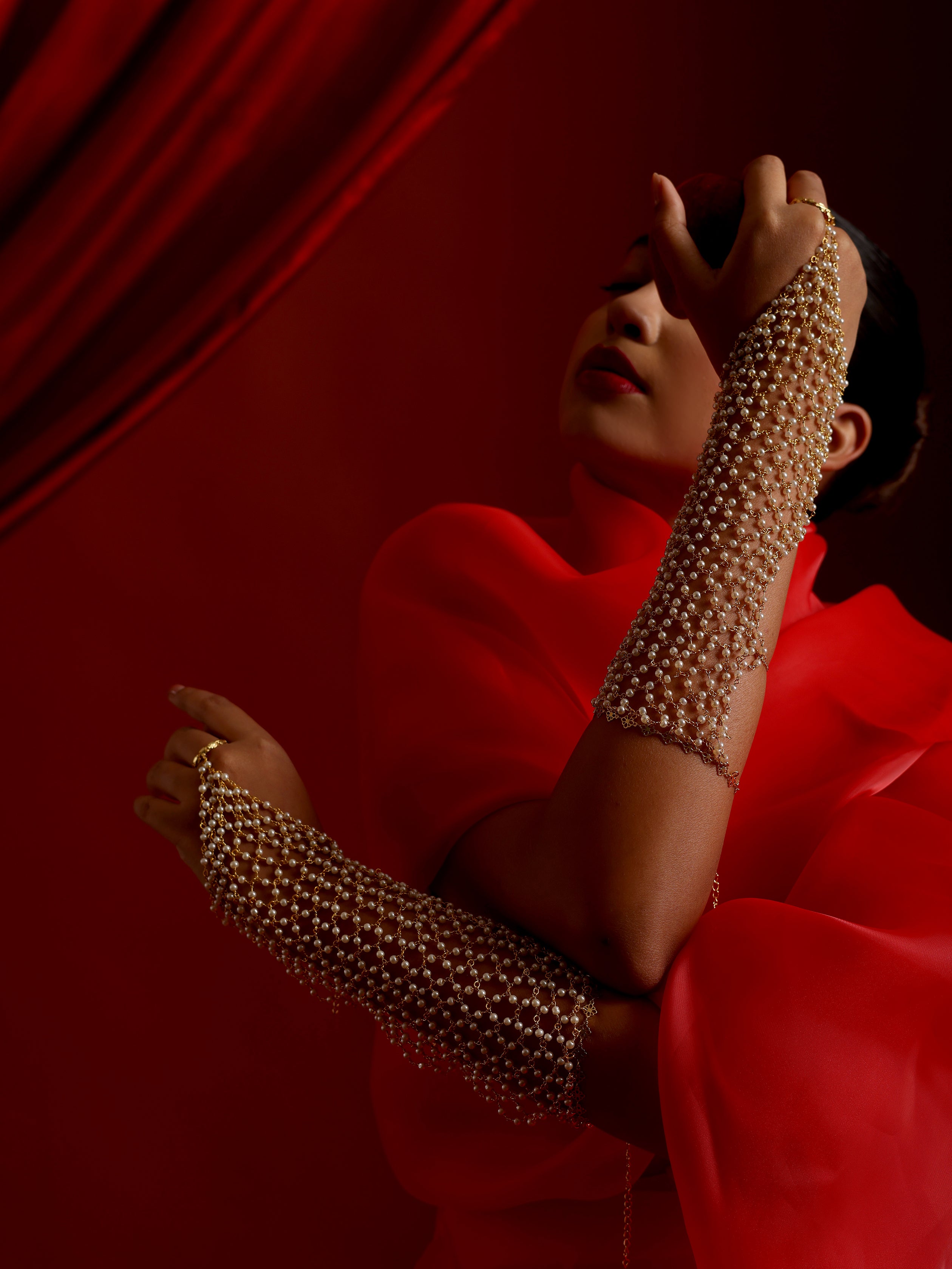 Pearl embellishment has long been a part of South Asian craftsmanship — from jewellery to textiles — where artisans hand-string beads to create flowing nets, borders, and decorative surfaces. The Motee Gloves draw inspiration from this tradition of pearl lattices, reimagining it in a modern, sculptural form.