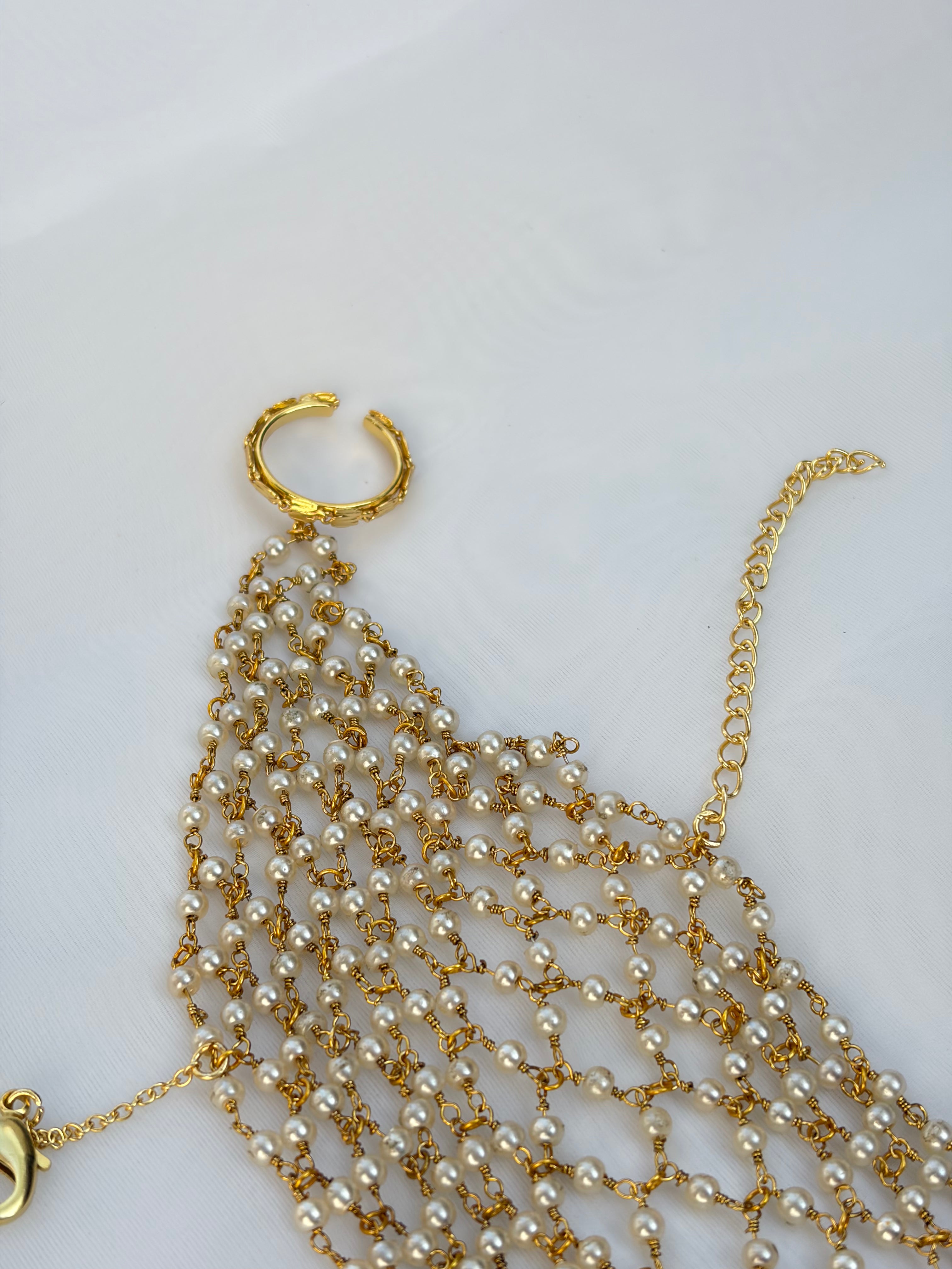 Each glove is made using dozens of hand-linked pearls that form a flexible mesh, creating a piece that moves with you and catches the light with every gesture. A contemporary take on handcrafted pearl artistry.
