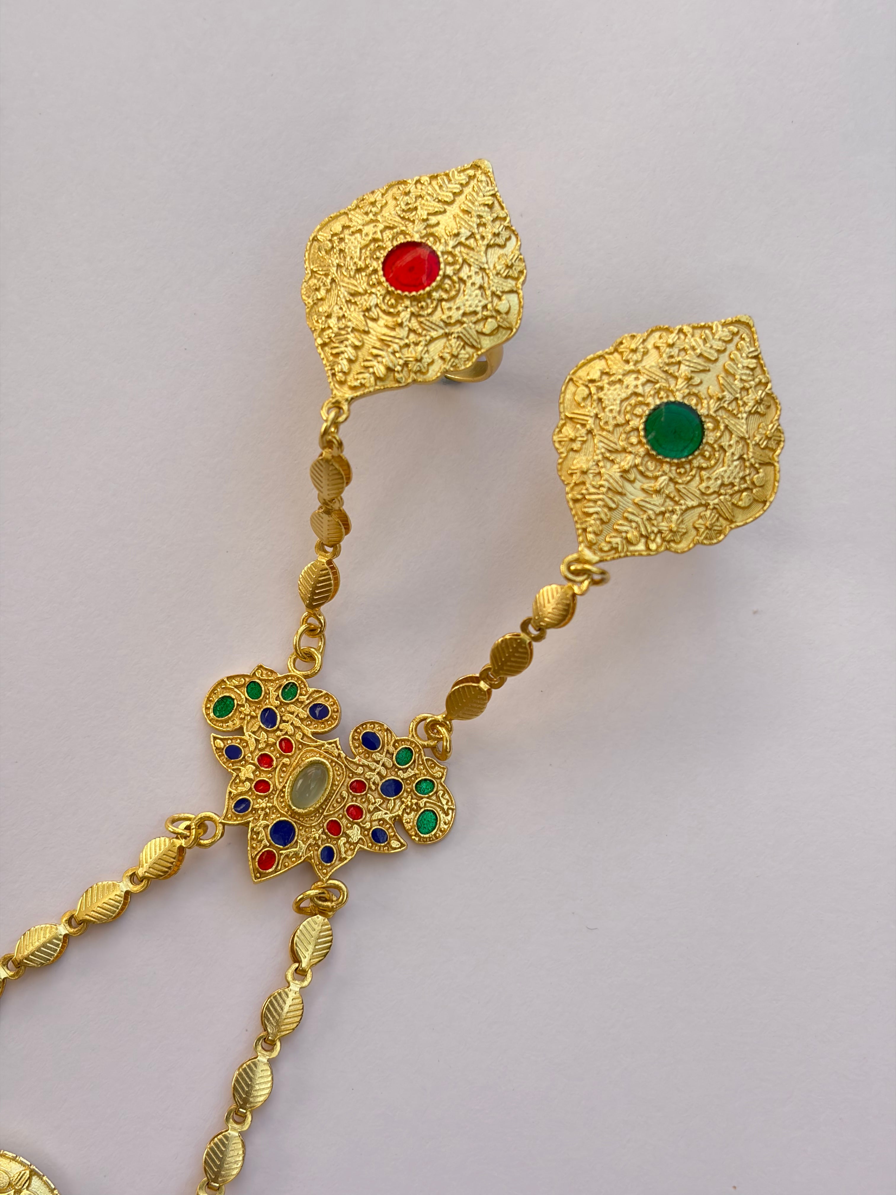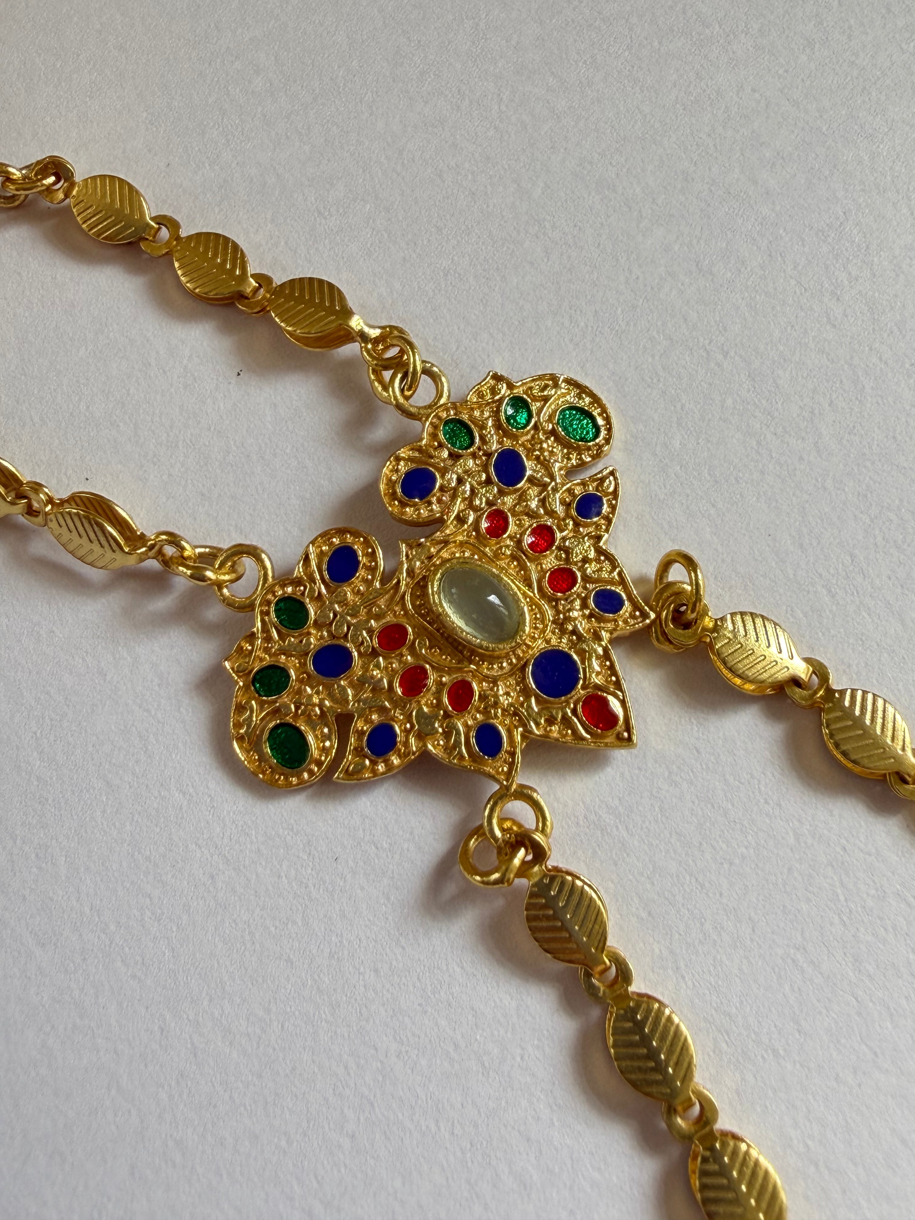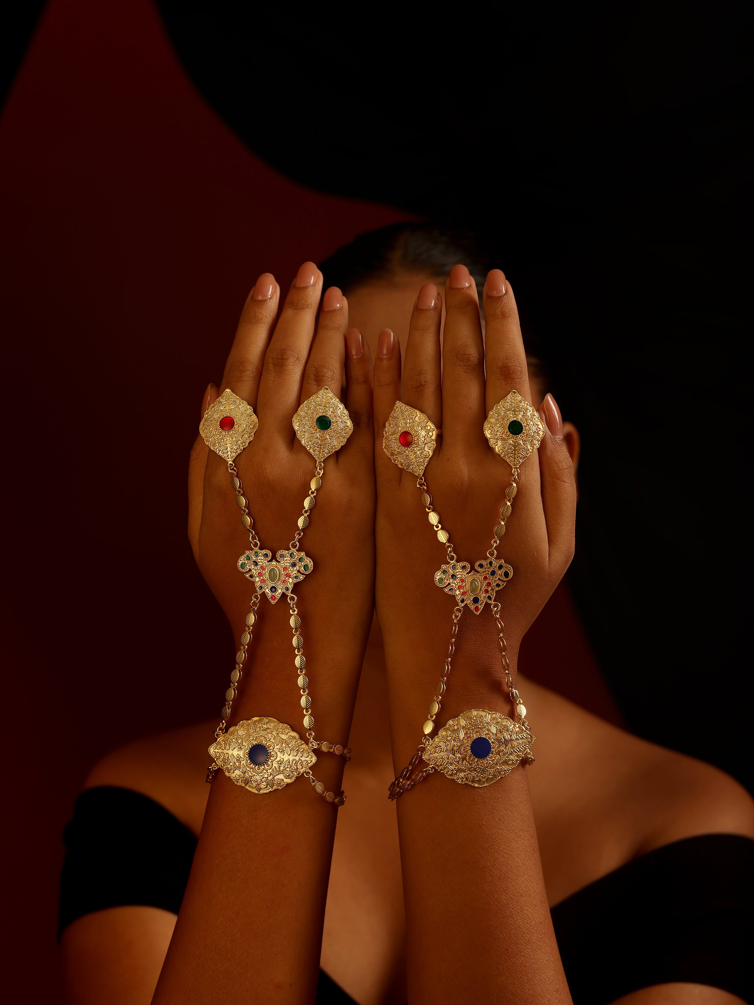 A bold haathphool featuring sculpted, hand-textured plaques set with coloured enamel accents and anchored by a striking chalcedony centre. Chunky, detailed, and designed to catch the light — this is a statement piece made to stand out on the hand.